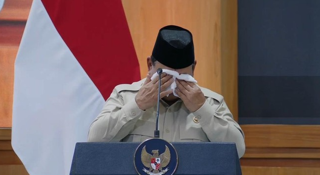 Tak lama setelah menyampaikan pernyataan tersebut, Prabowo terlihat mengusap air mata yang mengalir di pipinya menggunakan handuk kecil yang berada di depan podium.